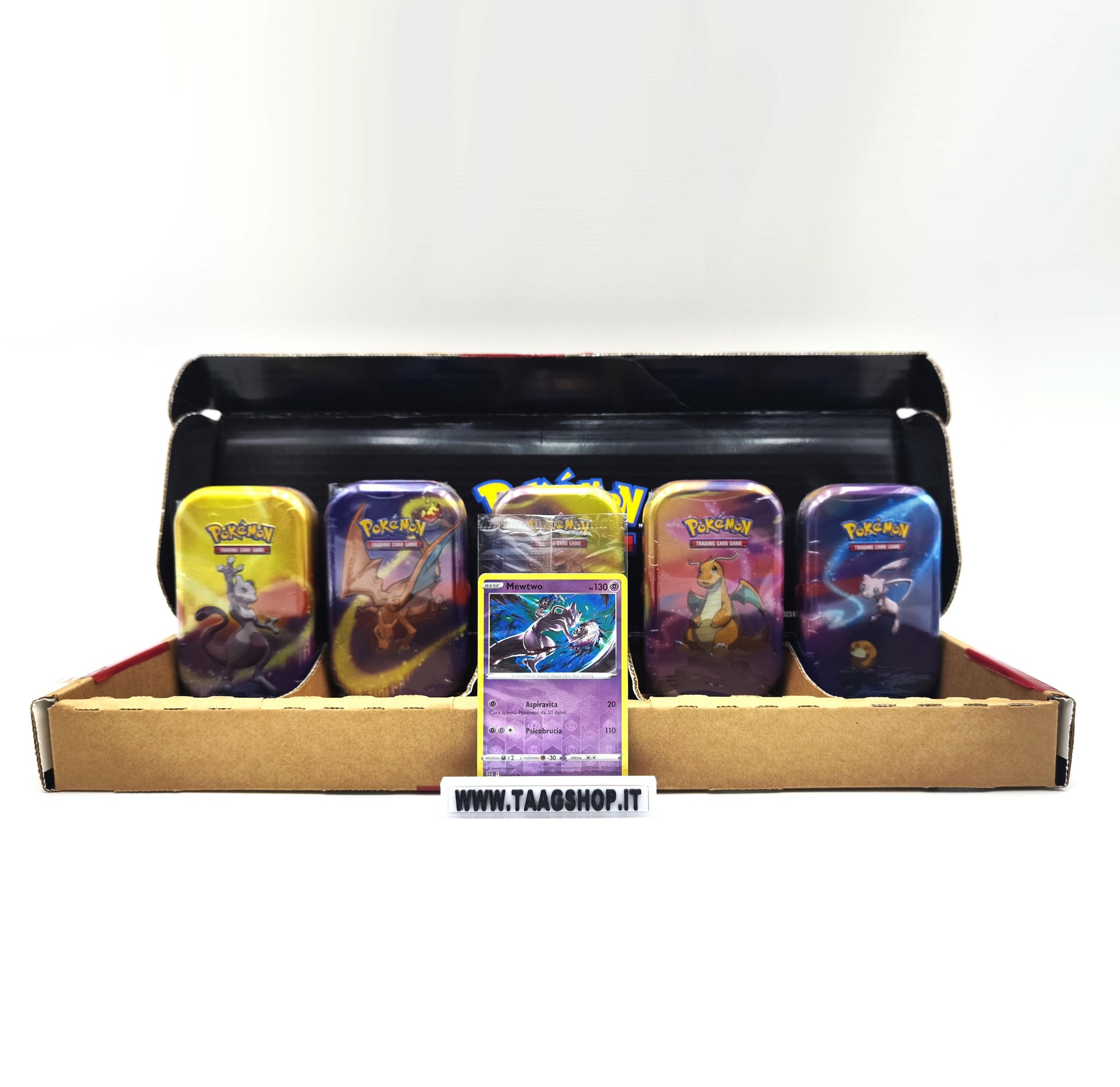 Ogni tin contiene: 2 bustine Pokémon + 1 moneta da collezione + 1 mini card illustrata